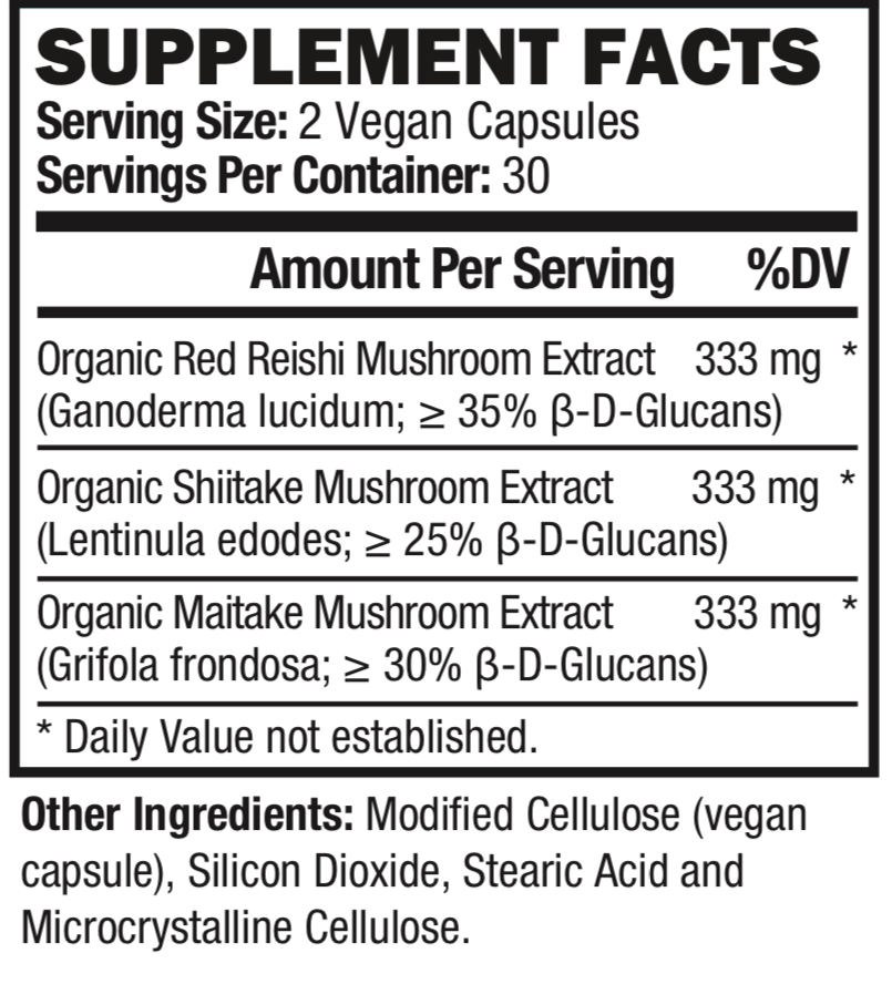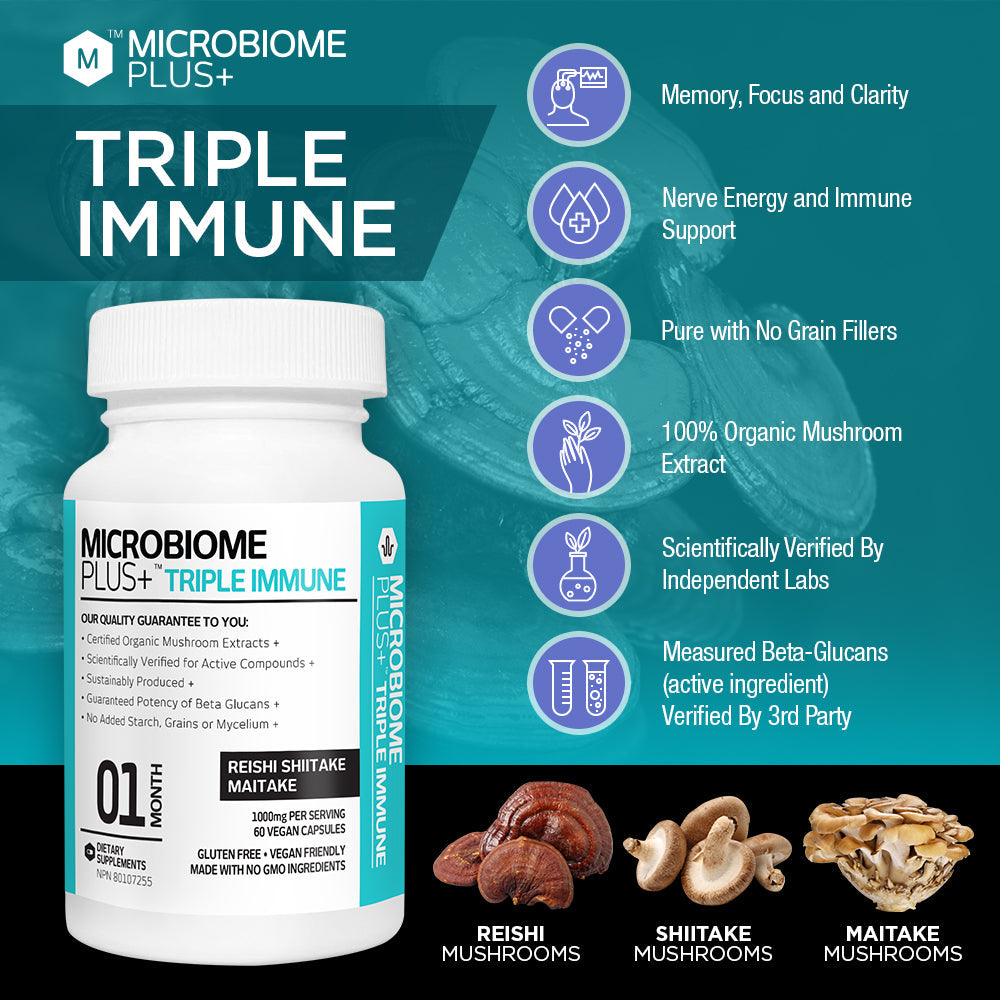 Reishi, shiitake, and maitake mushroom extracts in Triple Immune support both the innate and adaptive immune systems. This helps your body recognize any potential threats (like viral, bacterial, and yeast infections) and get better at fighting them off each time.†
