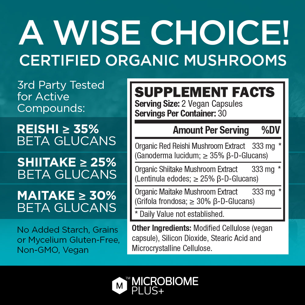 ✔ Clean: Microbiome Plus+ Triple Immune contains hot water extracts made from organic mushroom fruiting bodies only, packed into an all-natural plant-based capsule